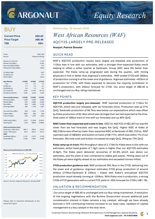 Latest research on gold producer @WAFresources $WAF from Argonaut below post yesterday's December quarter results, Buy and $6.40/share target maintained (~66% upside on current share price) 👇