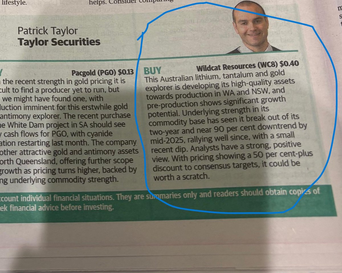 Good to see @WildcatRes_WC8 getting some mainstream attention in @westaustralian. Taylor Securities analyst Patrick Taylor has a BUY on #WC8 at $0.40, calling out its #lithium, #tantalum and #gold exposure and the pathway towards production in WA.